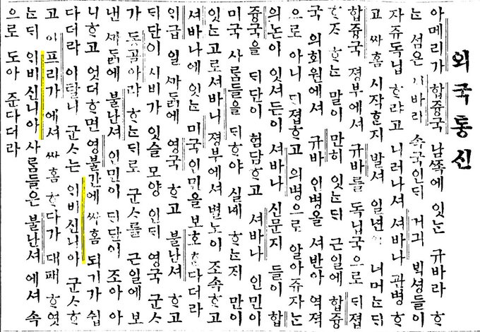 독립신문』 1896년 4월 7일 화요일자 외신; 쿠바독립전쟁 이야기, 영불전쟁, 그리고 이탈리아-"외비신니아" 전쟁. 외비신니아가 어느 나라인지 몰라서 찾아보니 "에티오피아". "~(하)다더라" 체의 표현도 재밌다. posted at 16:23:35 2018/03/12