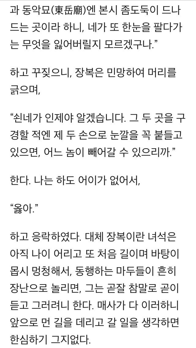 적반하장 유분수. 연암이 남의 집 오미자 두어개 집어 먹다 폭행사건으로 치달은 사연. 연암 曰,, “두어 낱의 오미자는 실로 한낱 지푸라기와 같은 물건이건마는 저 완패(頑悖)한 중이 나에게 무례(無禮)한 행위를 한 것은 가위 횡역(橫逆)의 경지에 이른 것이다”,,, 비겁한 변명입니다.