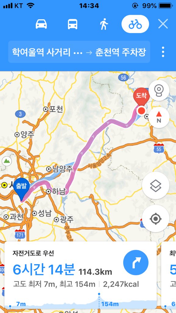 오늘 114km,, 춘천역 도착. posted at 14:36:10 2019/06/08