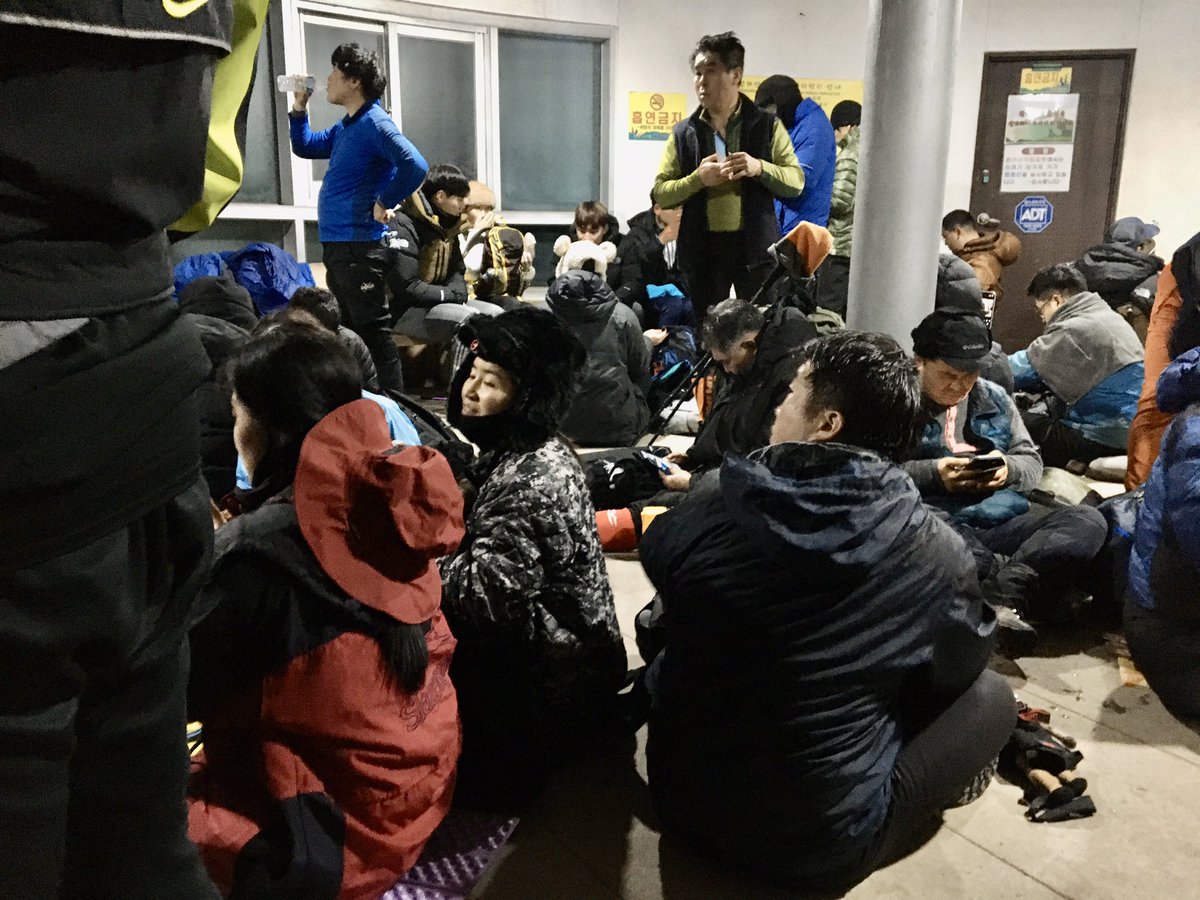2020년 00:00에 시작하는 한라산 새해 일출 등반을 기다리며, 관음사탐방안내소에서 쪼그려 기다리고 있다.. posted at 23:33:26 2019/12/31