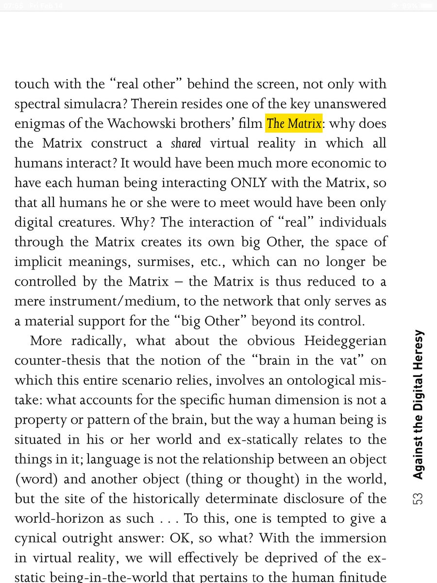 믿음에 대하여를 다시 읽다가...그러고 보니,,영화 매트릭스를 매개로 지젝 Zizek 을 처음으로 알게 되었다. 매트릭스 영화가 나오고 영화에 대한 온갖 찬사와 비평, 해석들이 난무할때,, 한글로 번역된 “매트릭스로 철학하기” 라는 책에서.. 그 이후 몇개의 글을 접하게 됨. posted at 08:09:03 2020/02/14