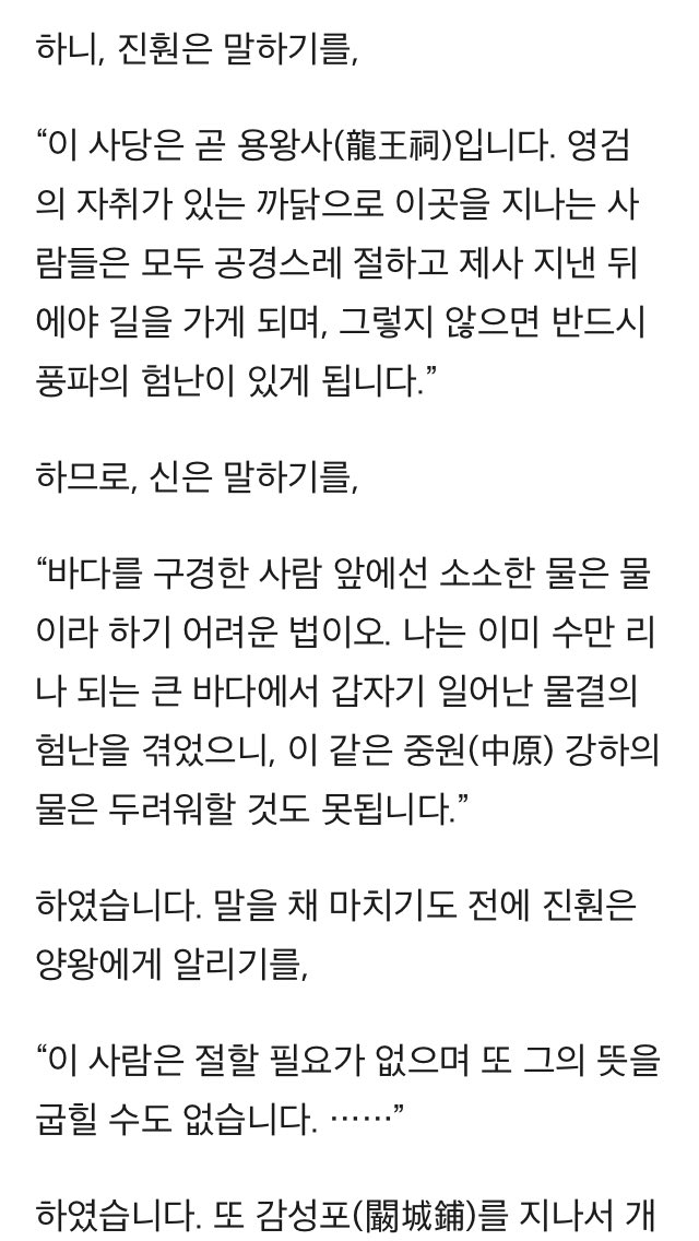 "今年是何年號。臣曰。弘治元年。又曰。日月不久。何以知之。臣曰。大明初出海上。萬邦所照。況我國與大國爲一家。貢獻不絶。何以不知。" 중국은 어버이의 나라, 한 가족... 참으로 깊고 위대한,, 사대존명의 정신...
