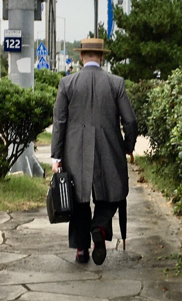 날도 덥고 습한 아침. 어떤 외국인 아저씨가 중절모에 코트를 입고, 양손엔 가방과 우산을 들고 길을 간다. posted at 08:33:24 2020/08/12