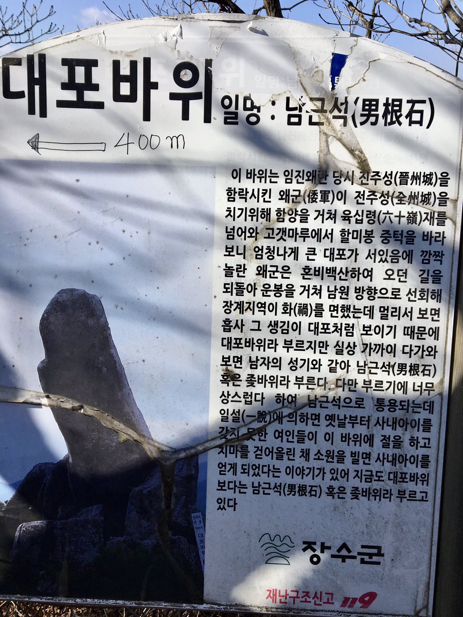 오늘 산보 중에 본 대포바위 a.k.a 남근석. 바위에 대한 설명이 참 거시기, 민망하구먼... posted at 17:03:03 2020/12/12