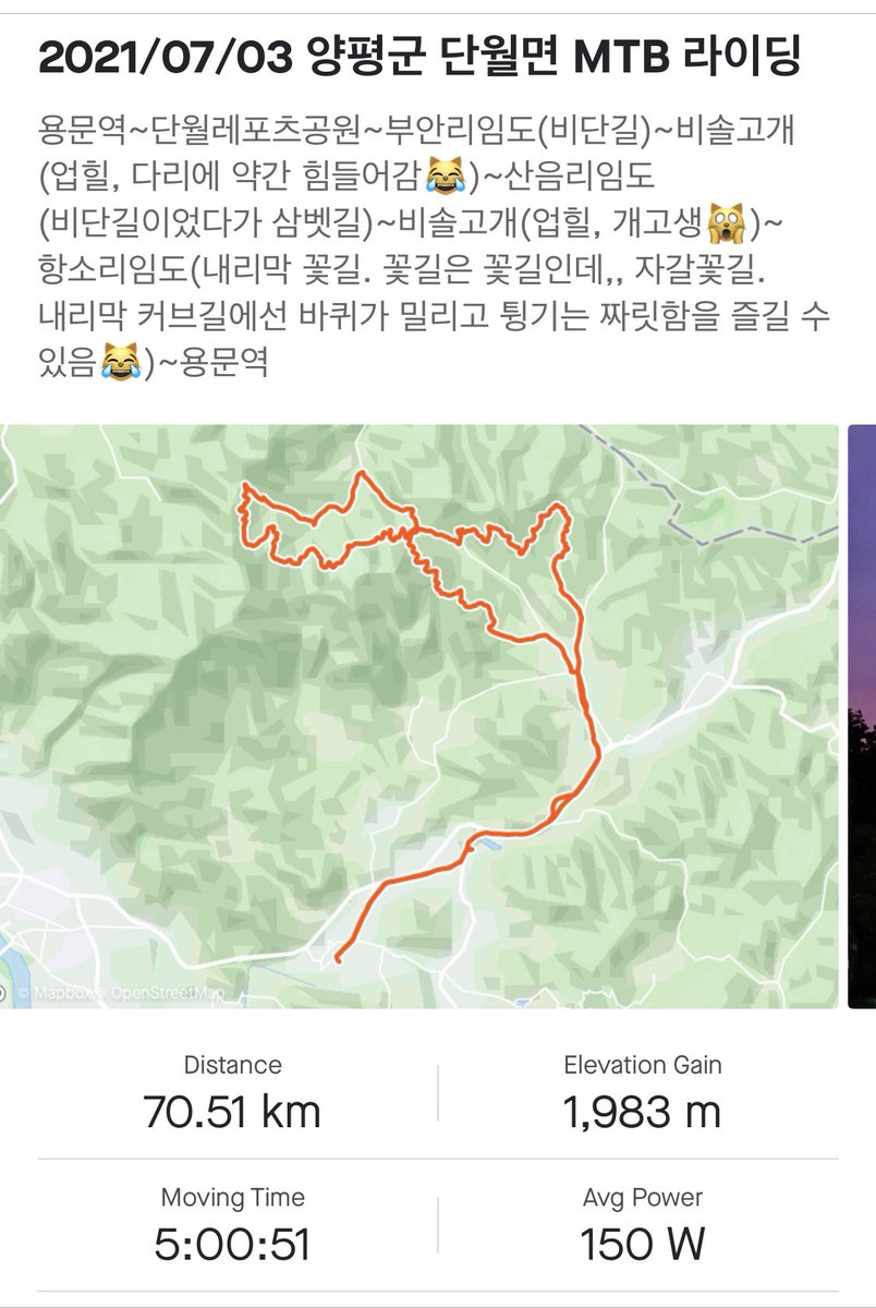 2021/07/03 양평군 단월면 MTB 라이딩 : 용문역~부안리임도(비단길)~비솔고개(업힐, 다리에 약간 힘들어감)~산음리임도(비단길이었다가 삼벳길)~비솔고개(업힐, 개고생🙀)~항소리임도(내리막 꽃길. 꽃길은 꽃길인데 자갈꽃길. 내리막 커브길에선 바퀴가 밀리고 튕기는 짜릿함을 즐길 수 있음😹)~용문역 posted at 14:10:15