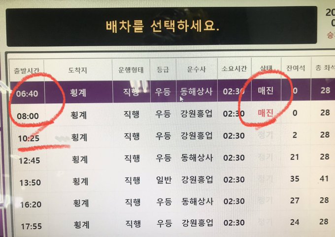 동창이 밝기도전 말을 달려 동서울 터미널에 도착해서 횡계가는 버스 끊으려 하니,, 첫번째와 두번째 운항버스 매진. 난감허네.. posted at 06:32:19 2021/10/23