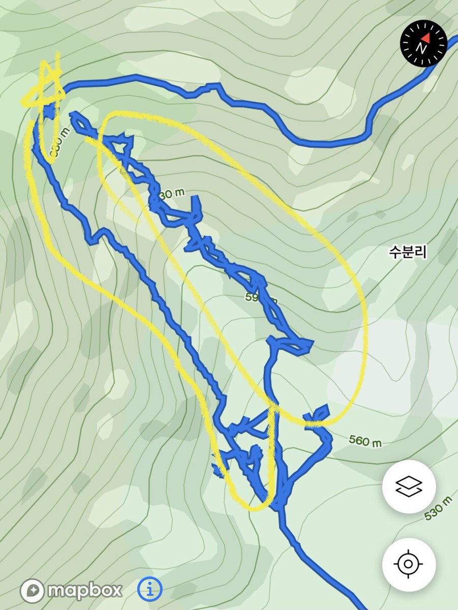 아래 노란색 타원형 부분 뜬봉샘 생태공원 주변에서 한참을 헤매었음.. 결국 왼쪽의 임도를 겨우 찾아 갔으나 경사도가 심해 별표친 뜬봉샘 근처까지 자전거를 끌고 올라갔다.