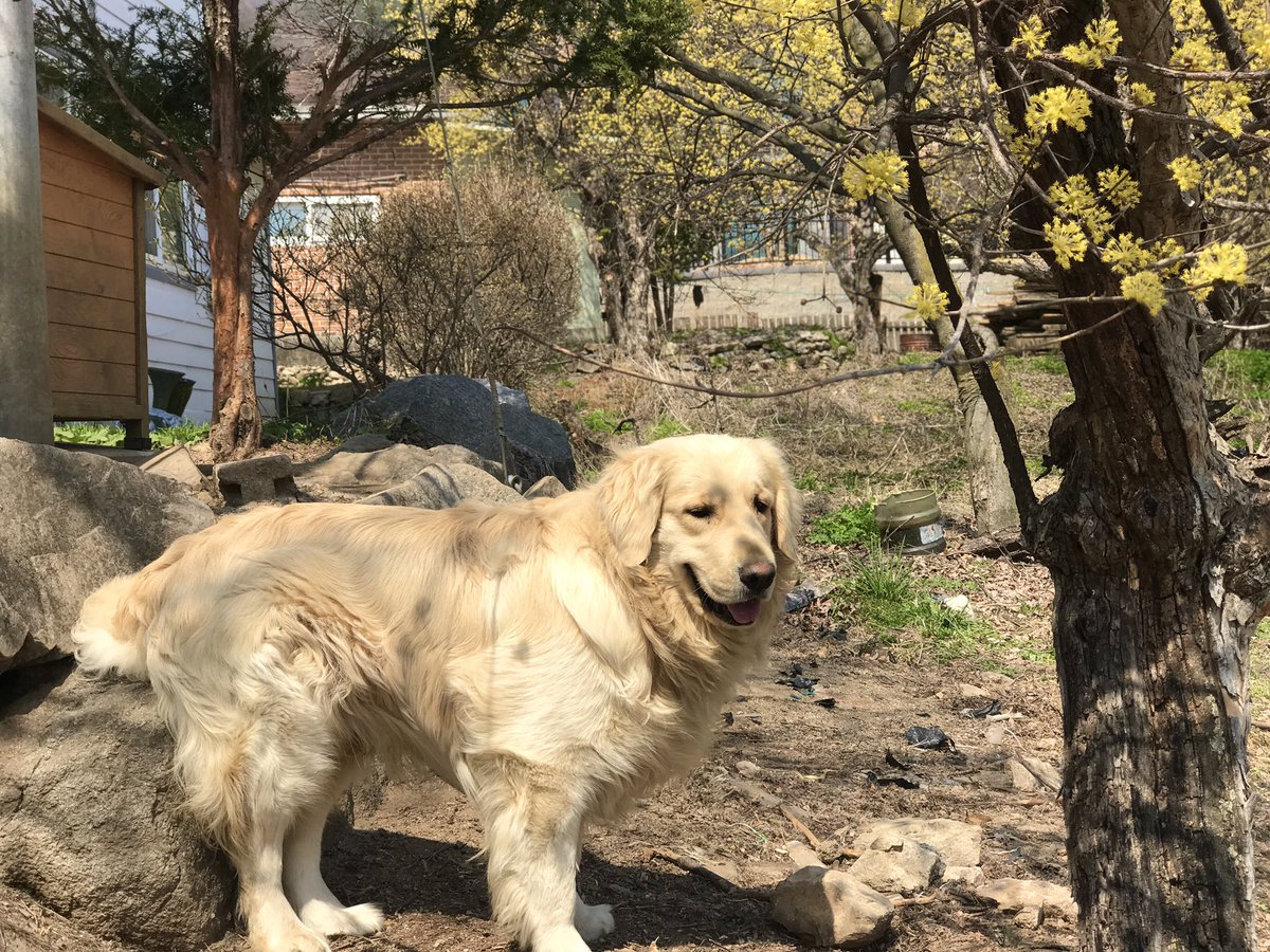 산수유꽃 아래 웃고 있는 댕댕이. 이천 산수유마을. posted at 12:42:28