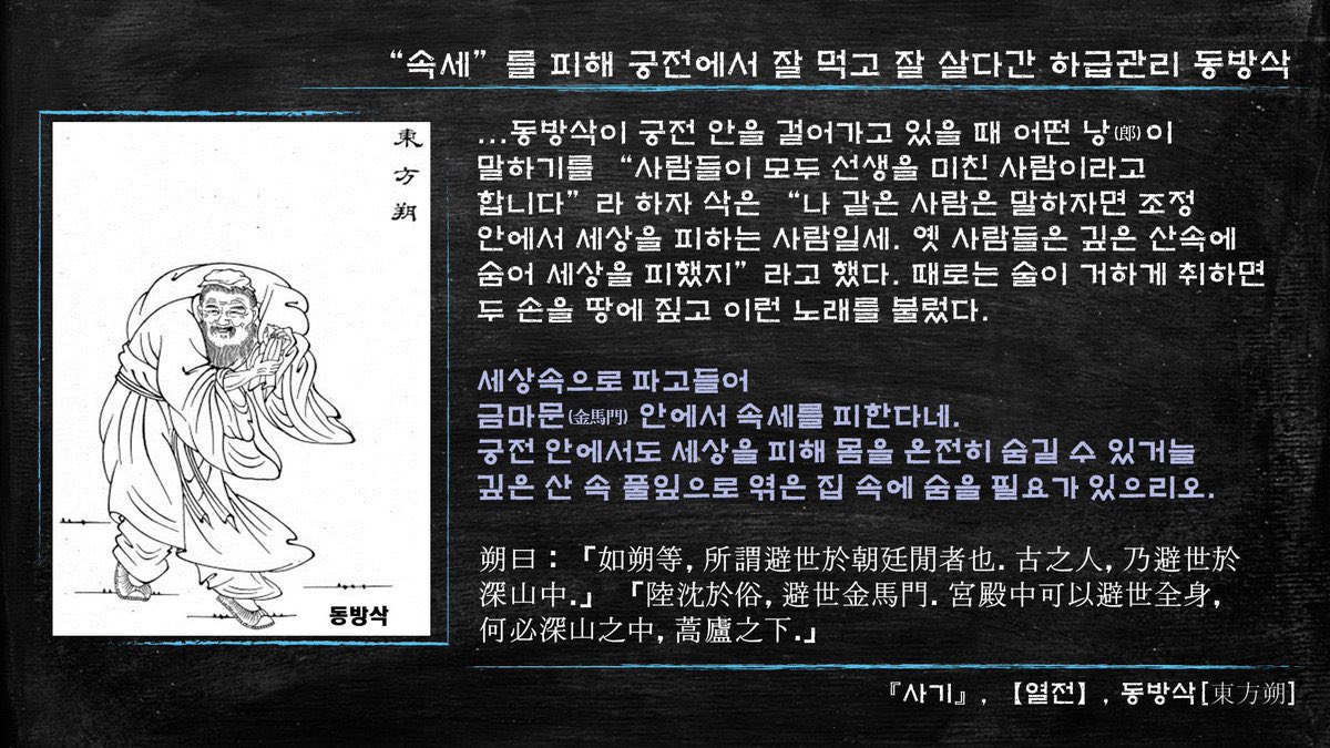 본받자, 동방삭!! "속세"를 피해 궁전에서 월급 받으며 잘~먹고 잘~살다간 하급관리 동방삭... "궁전안에서도 능히 세상을 피해 몸을 온전히 숨길 수 있거늘 깊은 산 속 풀잎으로 엮은 집 속에 숨을 필요가 뭐 있나?ㅎㅎ"