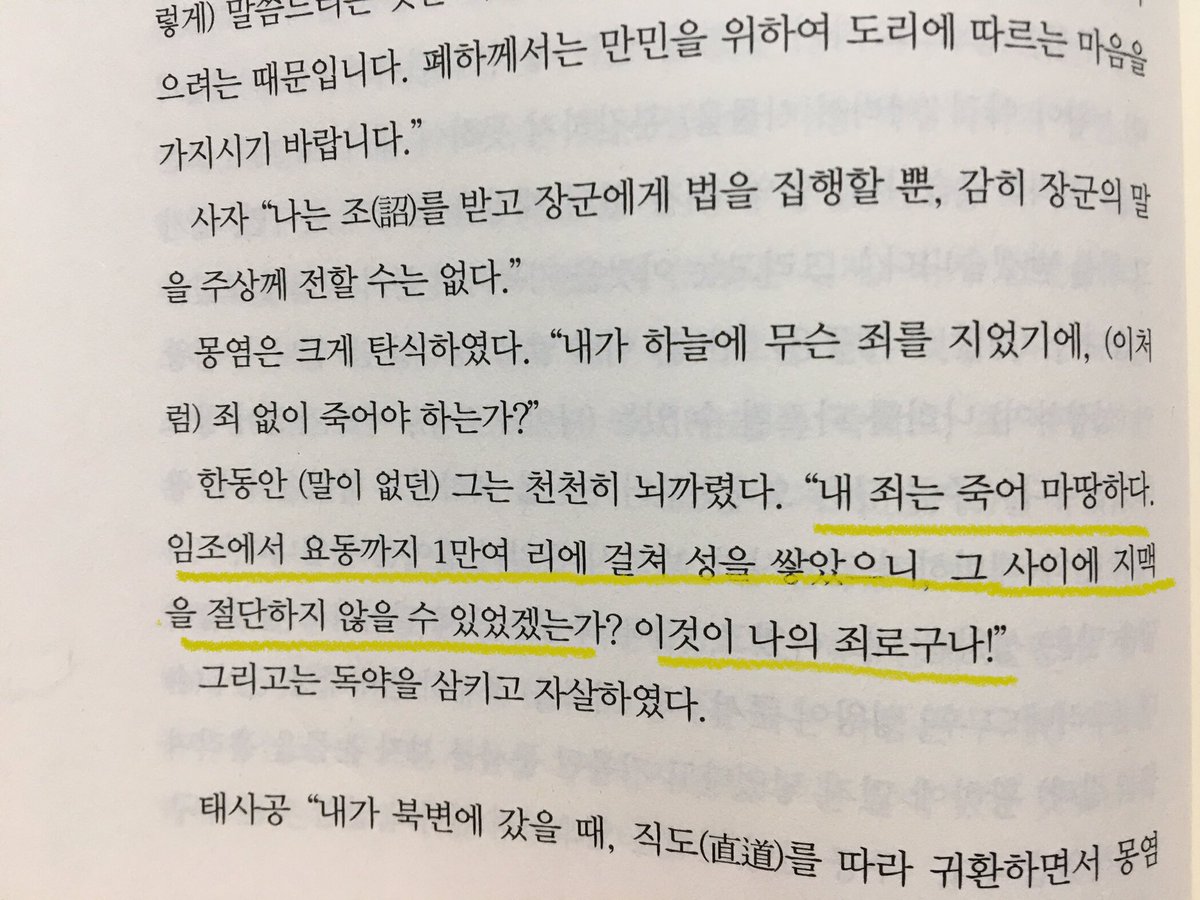 사마천, 까칠하네ㅎ.. 몽염이 (진시황 사후 권력투쟁에서 밀려 죽게 된 상황에서) 자살을 강요당하는 중 죄를 자백하는데, 만리장성 쌓으며 지맥을 끊은게 큰 죄이나 하였는데.. 태사공 曰; 지맥에게 죄는 무슨? 장성 쌓는다고 백성들 고혈을 빨은게 큰 죄이지..ㅎㅎposted at 21:46:20 2022/08/18
