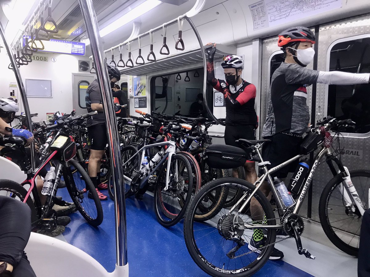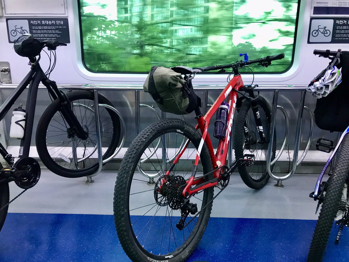 용문행. 전철안에 자전거가 많다. 좌우 옆좌석에 MTB파 누님들이 둘러싸고 있다. 60대 누님들...