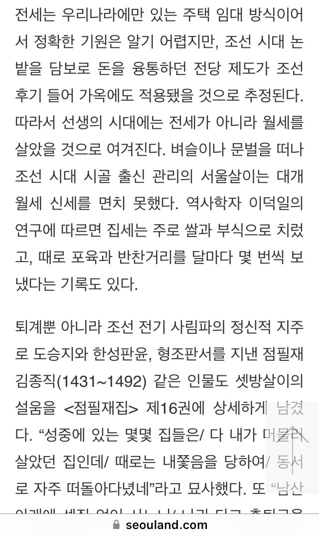 인터넷 검색해 보니, 조선시대 지방출신 중앙고위관료들도 셋방살이 한 경우가 많네.. 퇴계 이황과 김종직의 사례도 있네.. seouland.com/arti/culture/c… posted at 21:17:07 2022/10/18