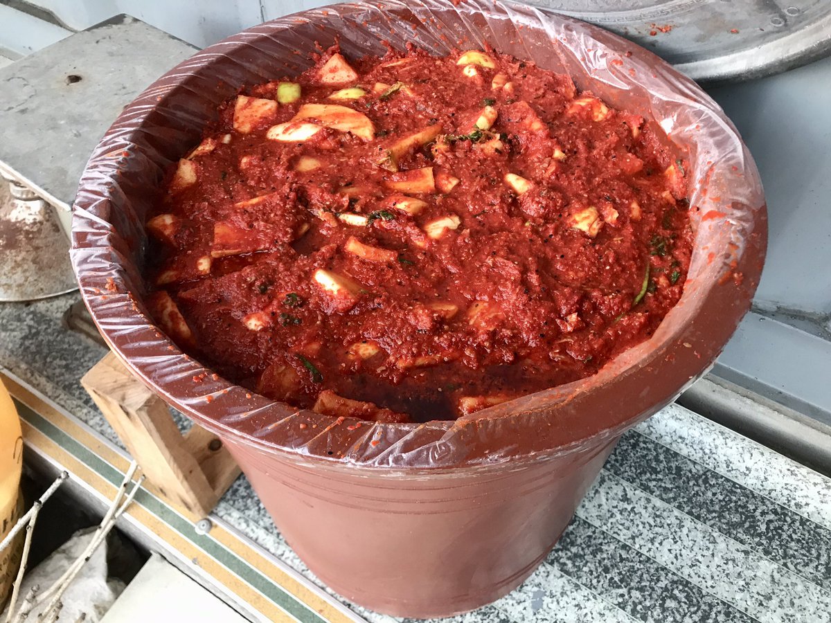 뭐니뭐니 해도 무 김치,, 사진은 미리 해 놓은 무김치 한 통. 양이 사진으로 보이는 거 보다 엄청남...이거 우리 형제자매가 냉장고용 김치통으로 각자 하나씩 담고도 반절이 남았음. posted at 23:17:35