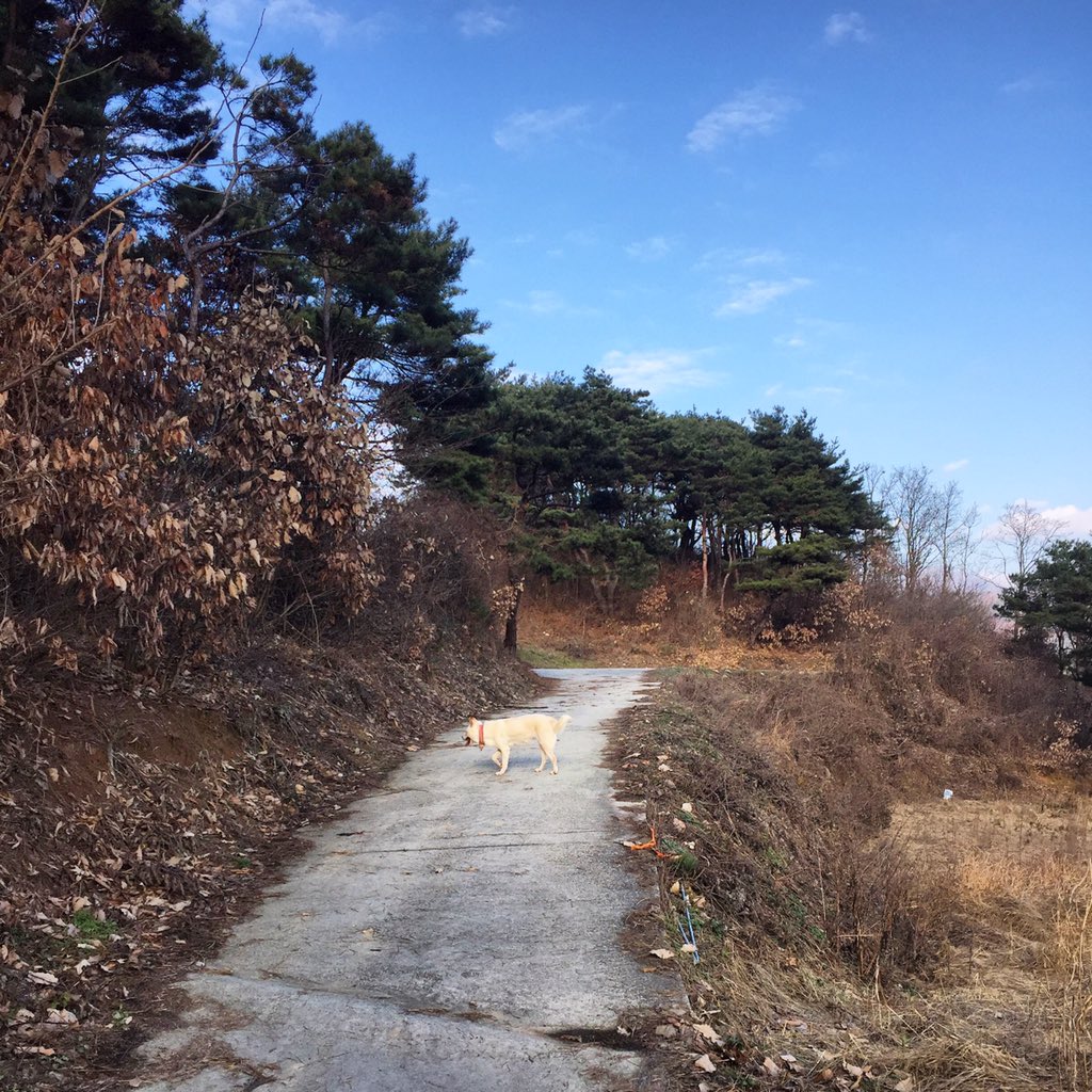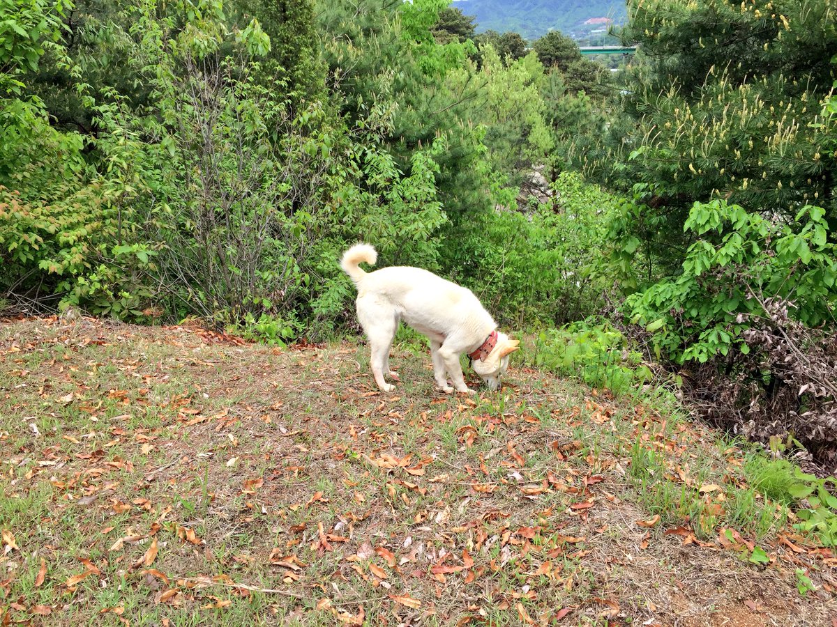 (침령산성) 우물터 주변에서 어슬렁거리는 별이. 아마, 별이는 오늘 태어나 처음으로 겪는 힘든 산보길 이었을 것. 워낙 겁많은 겁보라서 가끔씩 어려운 길에선 낑낑거리며 제대로 따라오지도 못함ㅎ posted at 12:00:23 2017/05/04