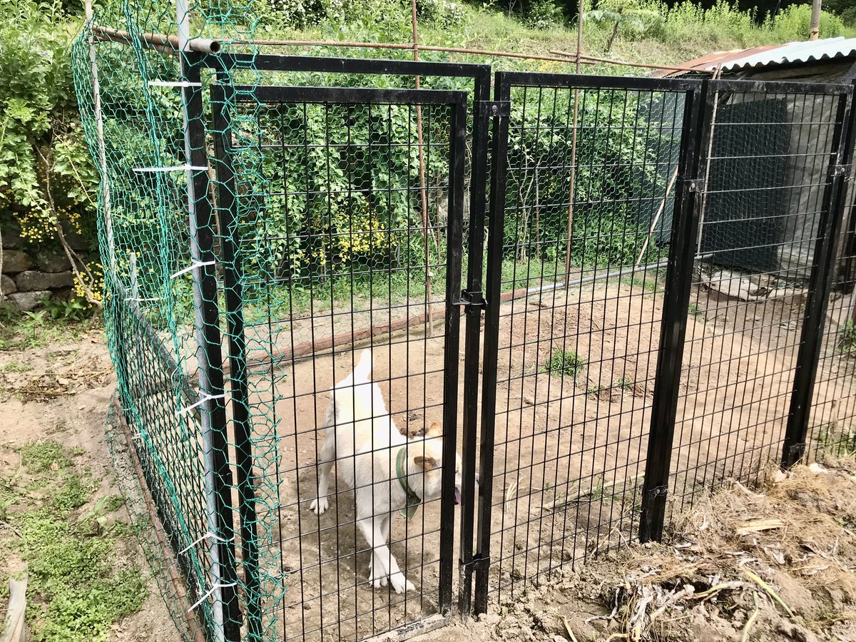 별이,, 그 동안 1m 쇠줄에 묶여 살았는데, 이젠 목줄은 풀렸지만 철장에 갇혀 있네. 작은 형님이 돈 들여 뒷밭에 케이지를 설치하였다 한다. posted at 10:31:06 2023/05/24